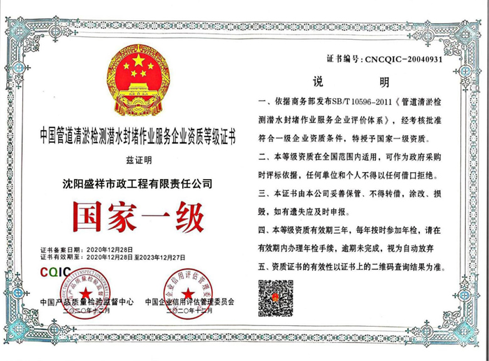 管道清淤修復(fù)與污水、化糞池整治處理服務(wù)企業(yè)資質(zhì)證書